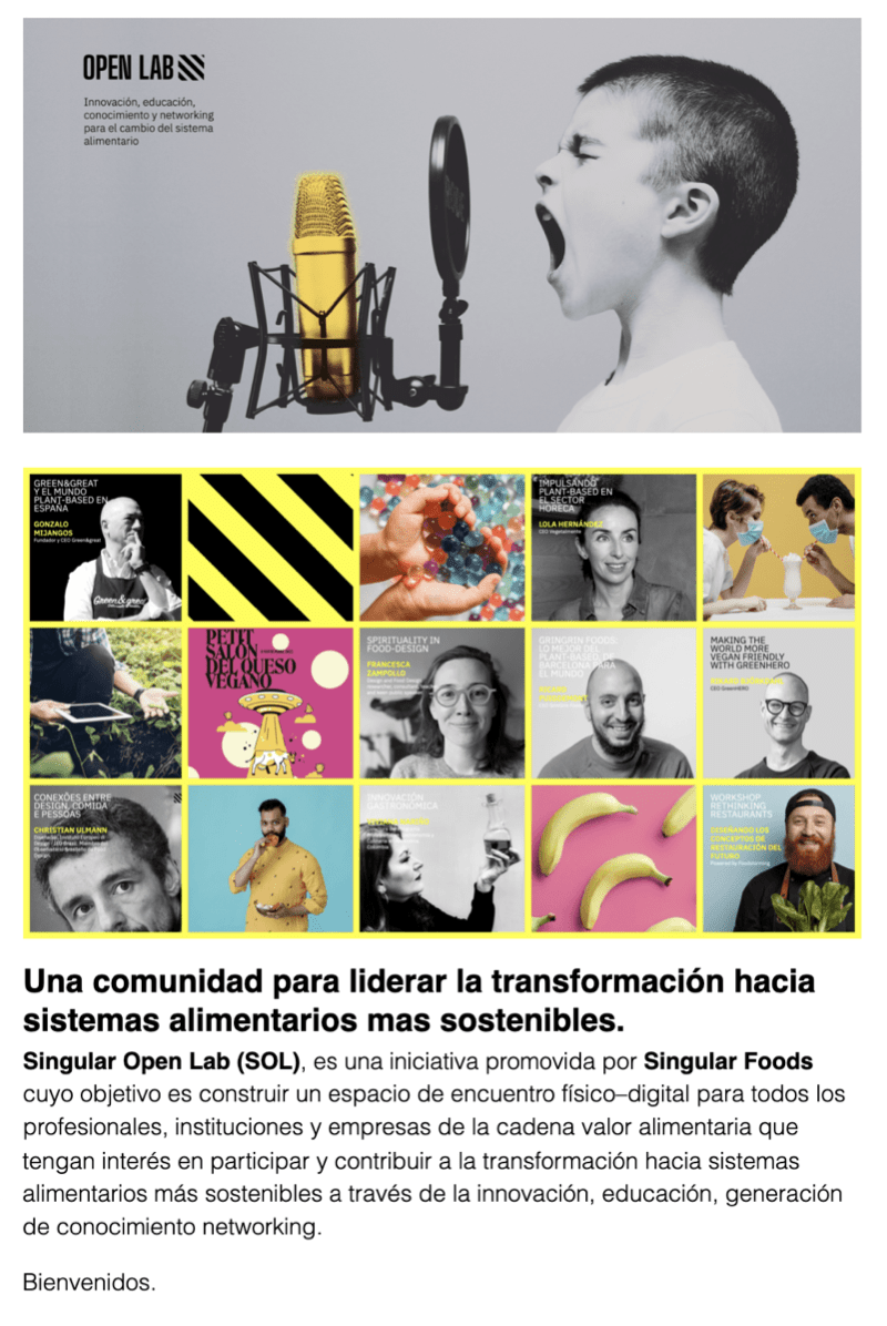 Ya están disponibles las news de Singular Open Lab con todos los contenidos, opentalks, diálogos, entrevistas y conferencias, workshops, masterclass, webinars y sesiones de trabajo con profesionales, instituciones y empresas de la cadena valor alimentaria que estamos desarrollando.
